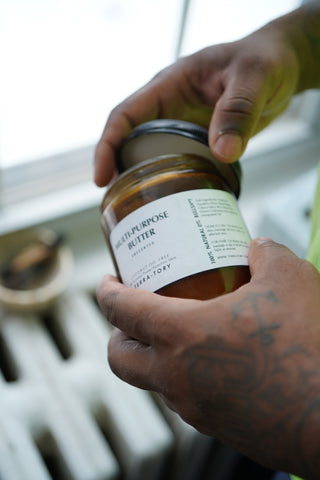 Close-up of a person's leg with a whipped shea butter on the skin.